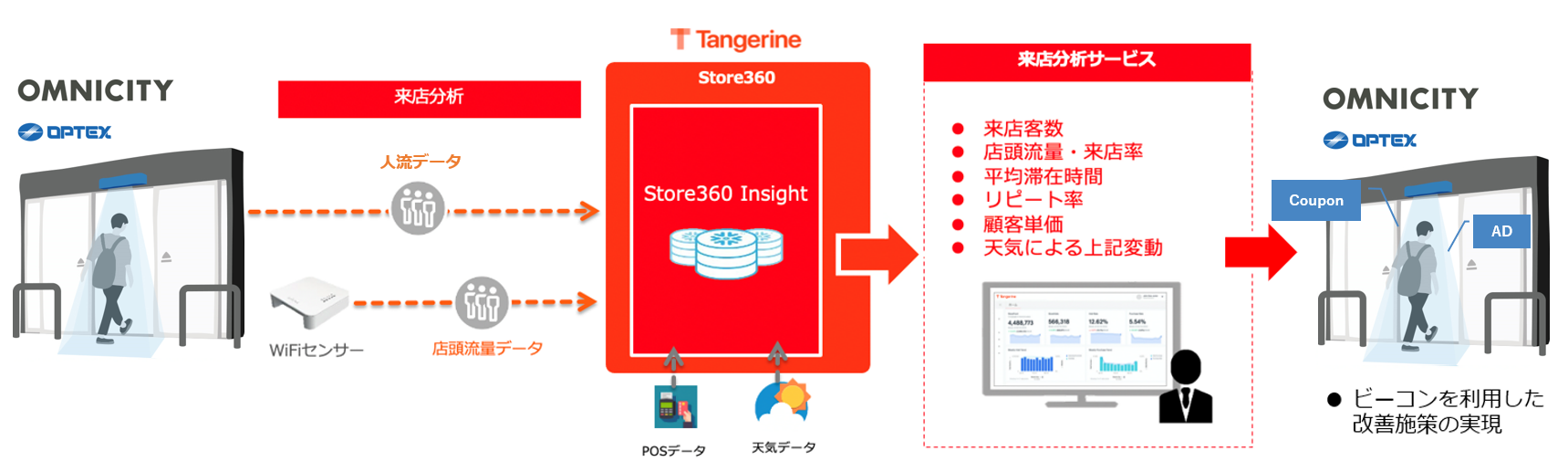 オプテックス株式会社(本社:滋賀県大津市、代表取締役社長:上村 透、以下「オプテックス」)は、Tangerine株式会社(東京都港区 代表取締役:平井 清人、以下「Tangerine」)が提供する「Store360 Insight」が、ビーコン内蔵自動ドアセンサーによるオプテックス独自の情報取得・配信プラットフォーム「OMNICITY(オムニシティ)」の取得データを活用し、世界初※の来店・購買分析サービスの提供を開始いたしましたことをお知らせいたします。