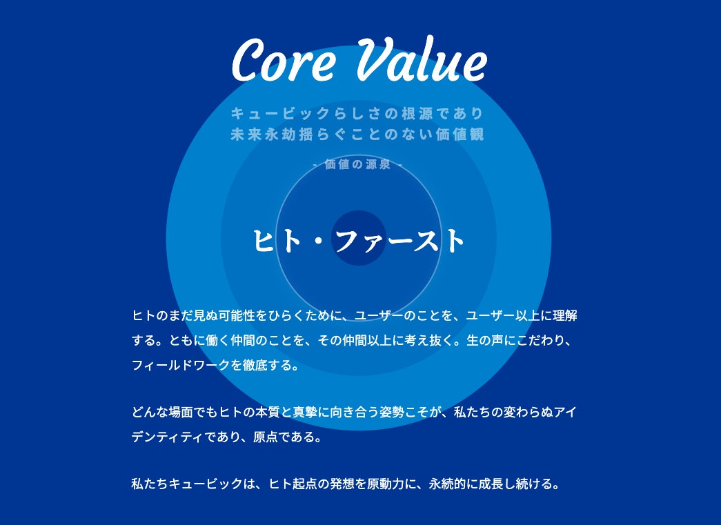 キュービックは、「インサイトに挑み、ヒトにたしかな前進を。」をミッションに掲げ、人々をよりスムーズな課題解決体験へと導いています。