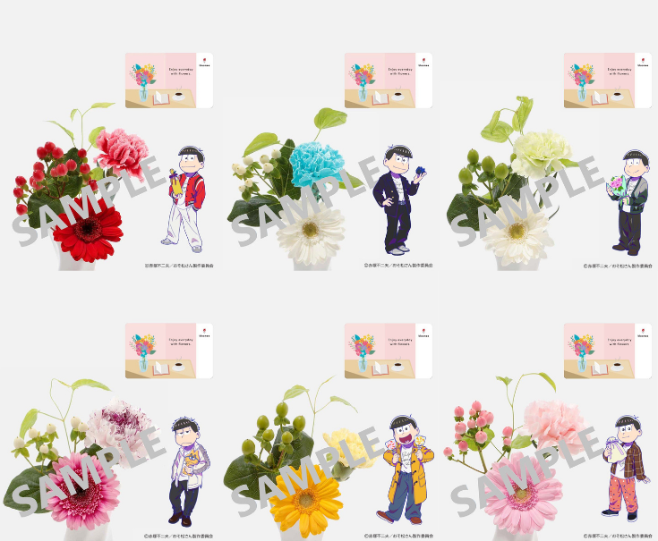 お花ブランド「ブルーミー(bloomee)」より、6つ子をそれぞれイメージしたフラワーブーケ、6つ子のアクリルスティック、6つ子それぞれのメッセージが入ったオリジナルギフトカードのセットが届きます。