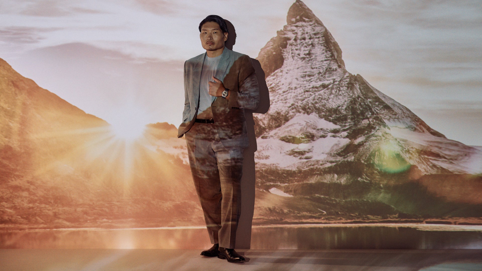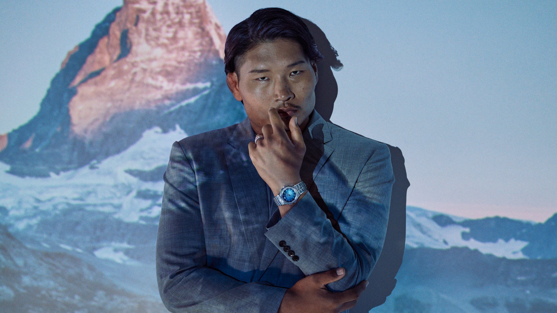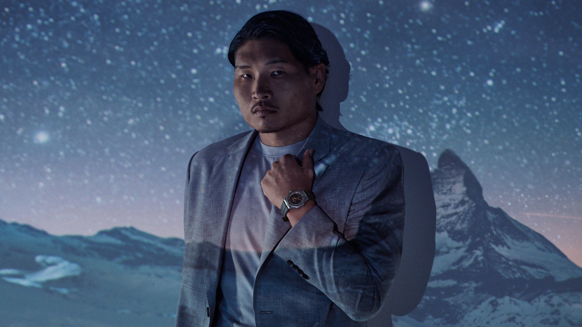 稲垣啓太さんが登場する新たなビジュアル6枚を特設サイトにて公開いたします。ビジュアルのテーマは「アルプスの大自然との融合」。これまでのビジュアルと同様に、アルパイン イーグルが宿す力強さとアルプスの荘厳な自然を表現しつつ、今回はさらに“エレガンス”を映し出しています。アルプスと聞くと多くの人がブルーを思い描きますが、実はその色彩は時間によって鮮やかに変化します。本ビジュアルは、普遍的な時を刻む時計の機能と、アルプスの移ろいゆく豊かな表情の変化を重ね合わせデザインしました。アルプスにそびえ立つマッターホルンを背に、グレーのスーツ姿で静かに佇む稲垣啓太さん。満点の星空や、夜明けの光など、アルプスが見せる多彩な表情を背景に、圧倒的なスケールと幻想的で崇高な美しさを描き出しています。