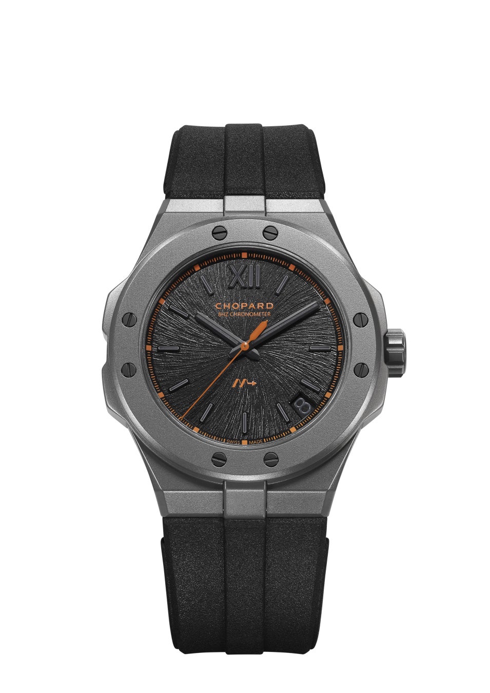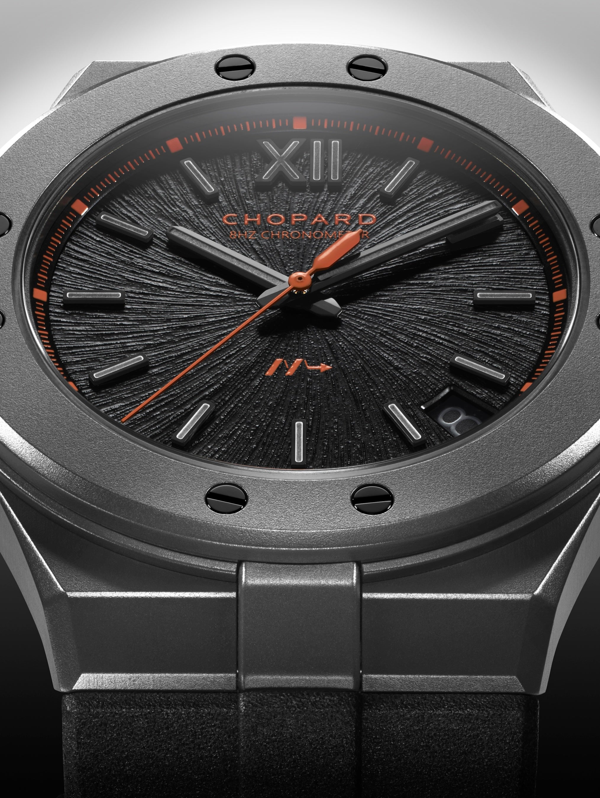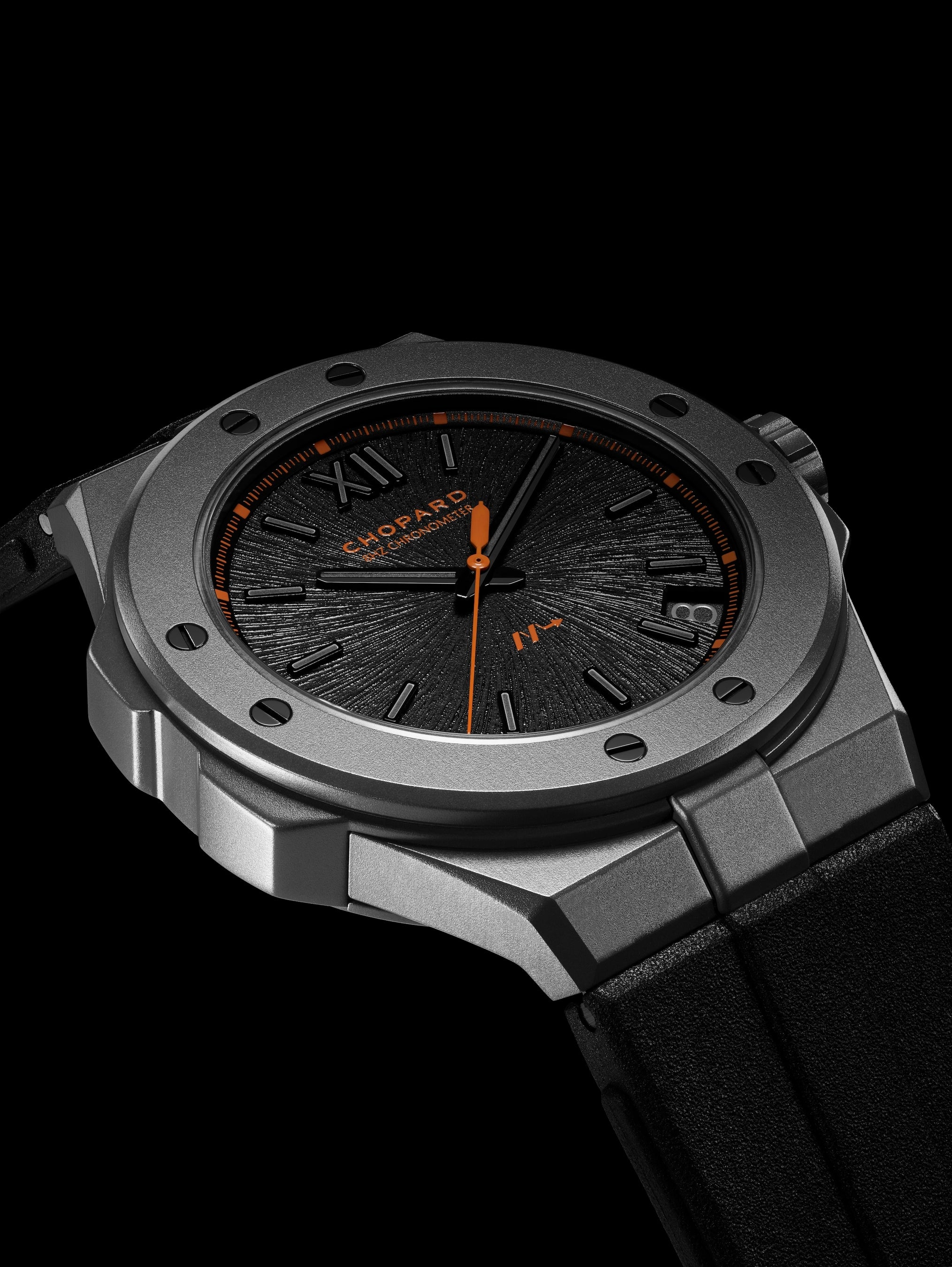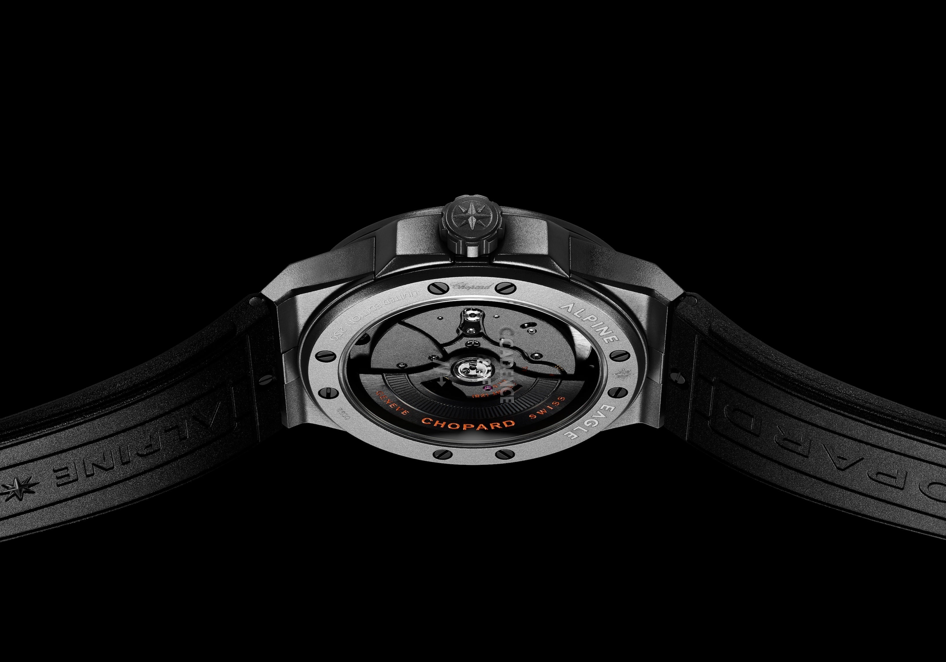 高振動モデルにおいて第三弾となるこの新作モデルは、コレクション史上最も軽量で、新たな頂点を極めます。モデル名に冠された「SL」は、“Super Light”を示し、現在までに製造された「アルパイン イーグル」において、間違いなく最軽量のモデルです。この偉業を達成するため、250本の限定エディションは、41mm径ケース、リューズ、そしてベゼルはセラマイズドチタンで製造され、「アルパイン イーグル ケイデンス 8HF」シリーズでは初となるラバーストラップを採用しています。搭載されたクロノメーター認定の高振動キャリバー「Chopard 01.14-C」の地板とブリッジにも同様にセラミック加工チタンを使用することで、ムーブメントの軽量化を実現。最先端の素材と技術を組み合わせ、完璧に極められた美を形成しています。