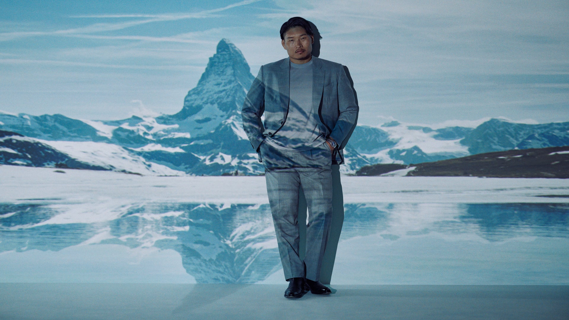 コレクション初となるプラチナ製で、光の変化や時間の経過とともに透明から濃い色へと反射が移り変わる氷河やアルプスの湖の煌めく美しさに着想を得た「Shades of Ice(シェイド オブ アイス)」ブルーのグラデーションが施された文字盤を備えます。このタイムピースを着用した稲垣さんが登場するのは、マッターホルンを背に静寂な湖が映されたビジュアルです。
