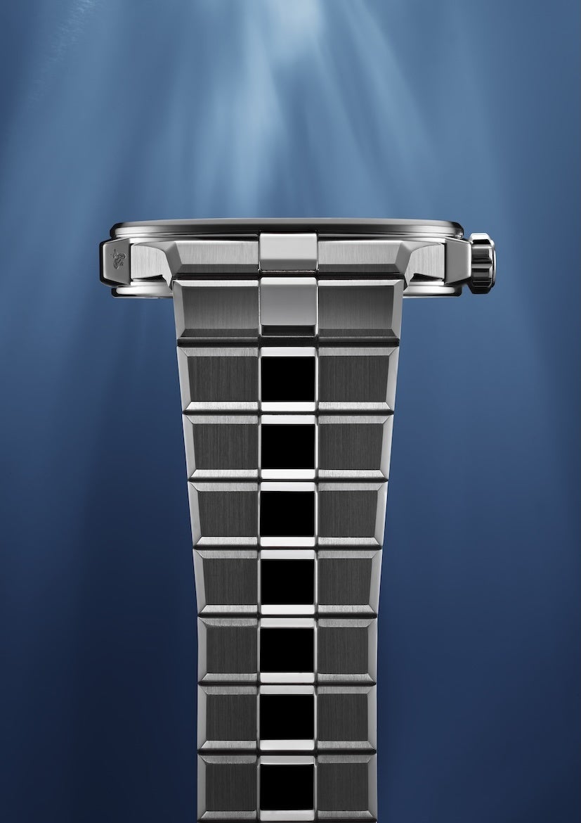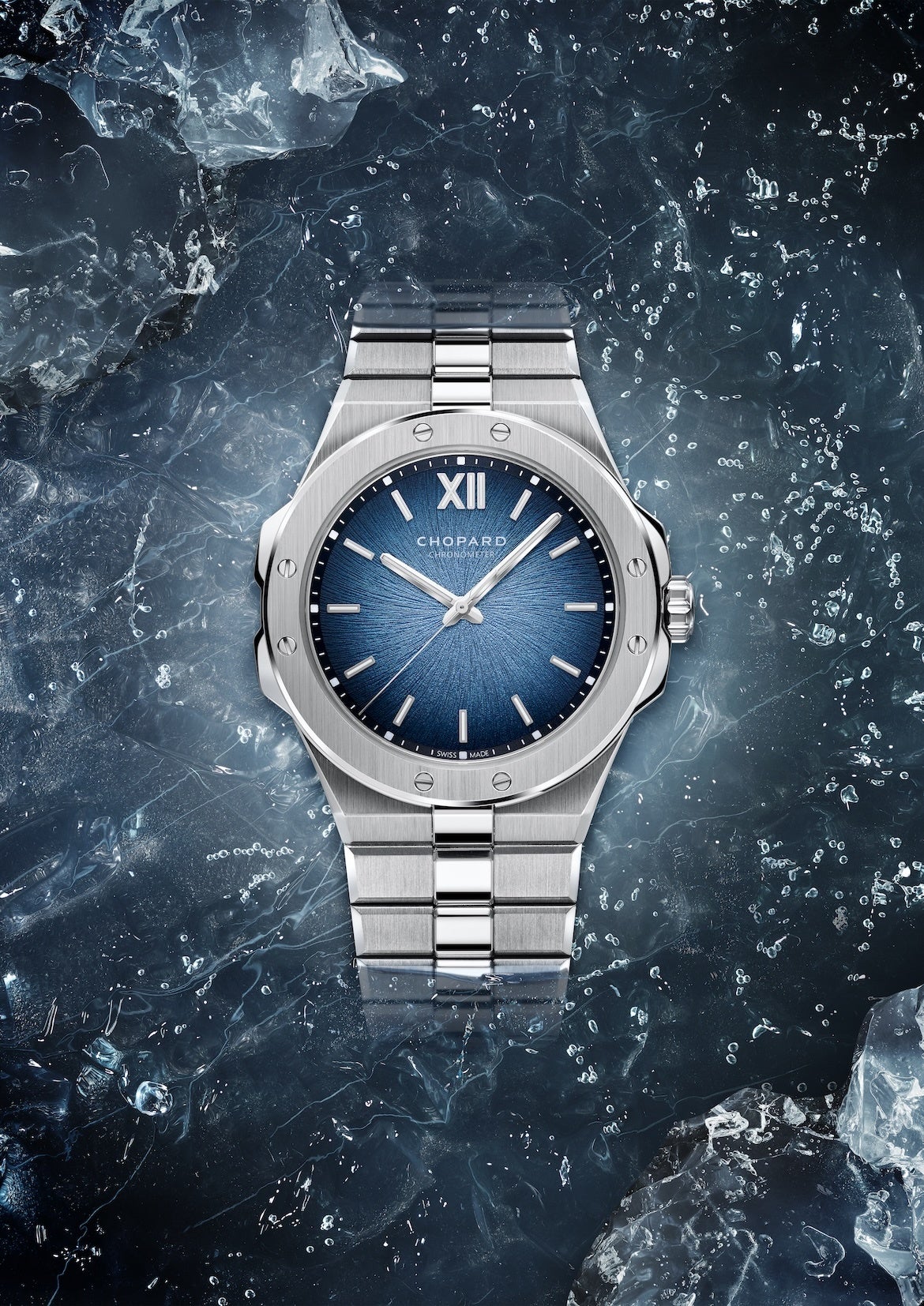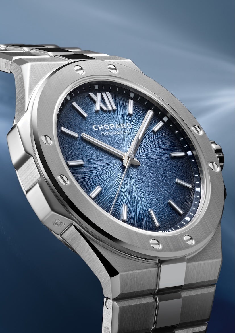 今年初めて、「アルパイン イーグル」スポーツウォッチコレクションに、超薄型“41 XP”ケースとリデザインされたブレスレットの絶妙なバランスを特徴とする特別なプラチナ製タイムピースが加わりました。傑出した純度を誇るプラチナで作り上げられたこのモデルには、地球温暖化の影響で危機に瀕しているアルプス氷河の色彩の変化にインスパイアされた「Shades of Ice(シェイド オブ アイス)」ブルーのグラデーションを施した文字盤とホワイトゴールド製の針を配しています。モデル名の“CS”が示す通り、センターセコンドを備えるこの比類ないタイムピースは、ジュネーブ・シールとプラチナ製マイクロローターを搭載した超薄型のクロノメーター認定ムーブメント「L.U.C 96.42-L」によって駆動。100mの防水性を備え、強さと持久性に優れたラグジュアリースポーツウォッチです。