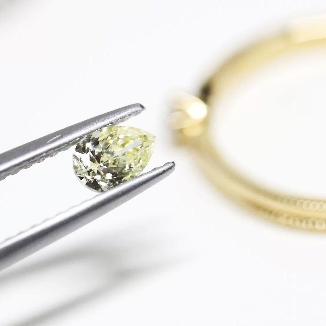 ひと目で分かる個性を求める方におすすめなのが、目にも爽やかなイエローの色合いと、洋なし(pear)の形をしたペアシェイプカットが施されたダイヤモンド。