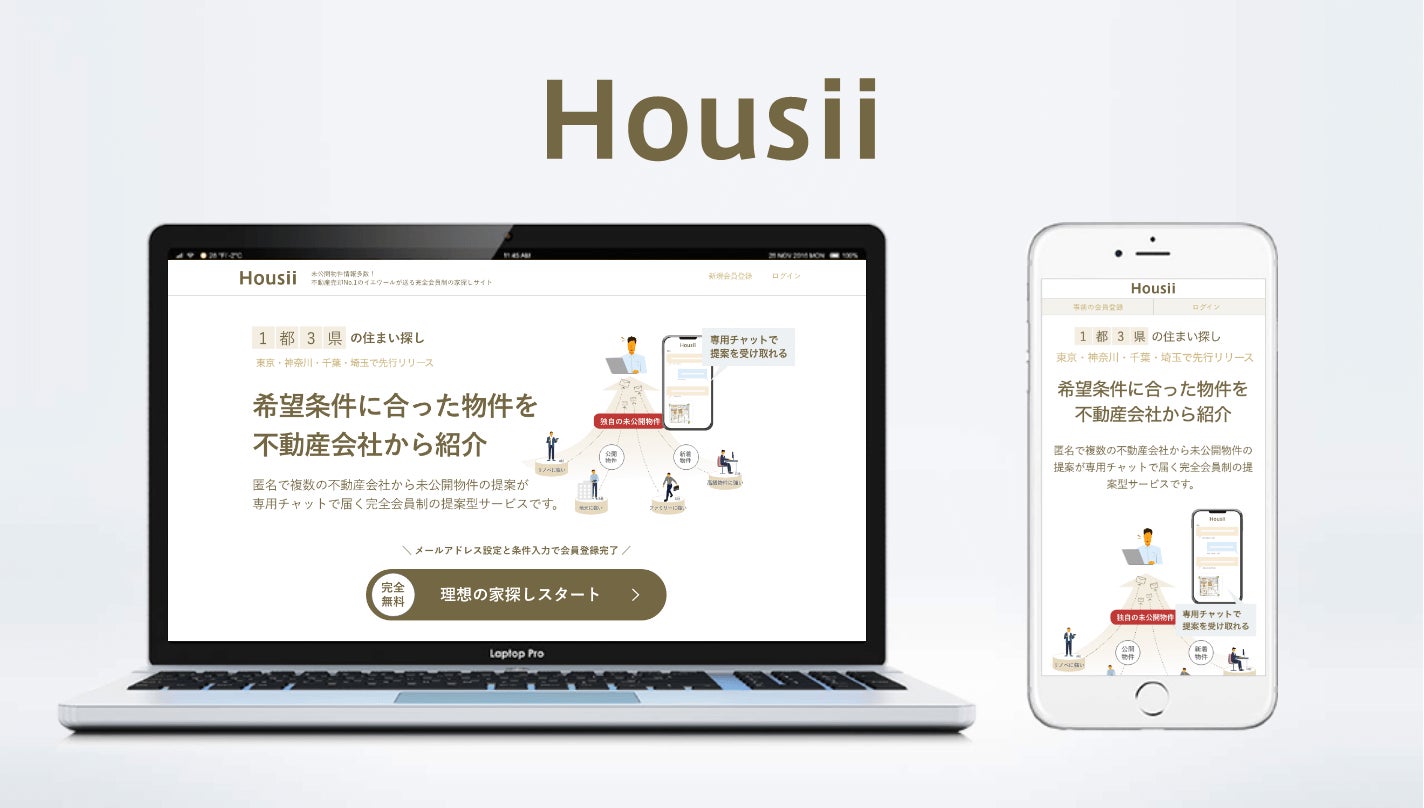 Housiiは、希望条件を登録して待つだけで不動産会社から希望にあった提案を受け取ることができるサービスです。現在既にベータ版を公開しており、2000名以上の方が登録。Housii経由で家を購入いただく方が増えております。