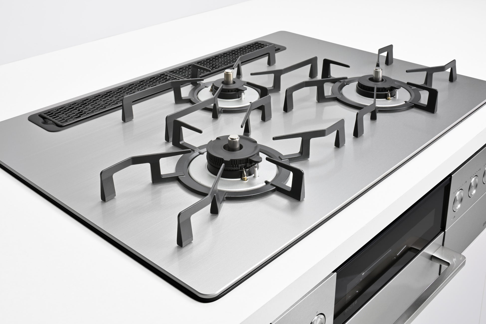 従来品は曲線的で柔らかい印象の五徳でしたが、直線的で堅牢なデザインに刷新し重厚感を演出します。また、3つの五徳が1つの大きな面となるように構成しています。個別の五徳にすることでお手入れに配慮しつつ、広い五徳面の上で思いのままに鍋ふり・鍋ずらしをすることができます。料理を積極的に楽しみたいユーザーが心置きなくコンロを使えるように、GRILLERの五徳はよりタフなデザインに進化しました。