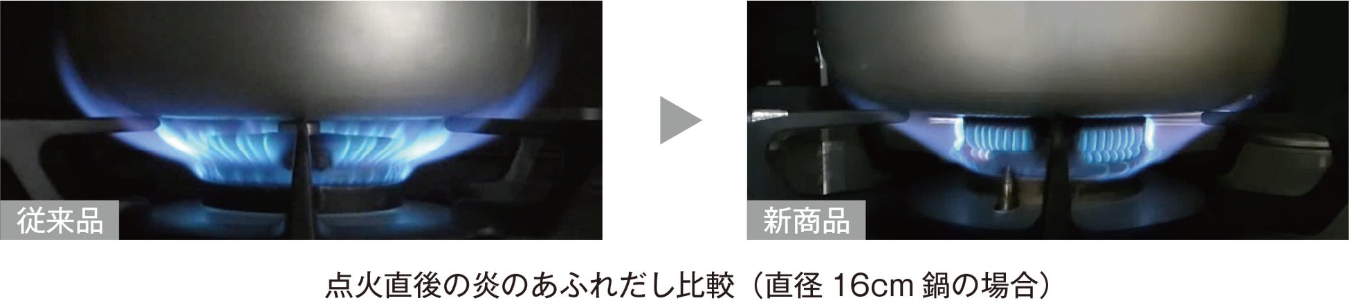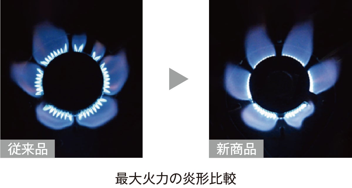 鍋底からはみ出した炎は衣服に着火するなどの危険を伴います。新バーナーはこれまでの強火力を維持しながら点火直後の炎の出力を抑えることで、より安全に調理ができるようになりました。また、バーナー形状の変更により炎の加熱領域が拡がったことで、鍋がムラなく、より均一に温まります。