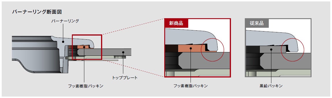 従来品はバーナーリングとトッププレートの間にわずかなすき間があり、煮こぼれが浸入することがありました。すき間を埋める新構造のパッキンを採用することでバーナー周りに汚れがこびりつきにくくなり、お手入れがしやすくなりました。