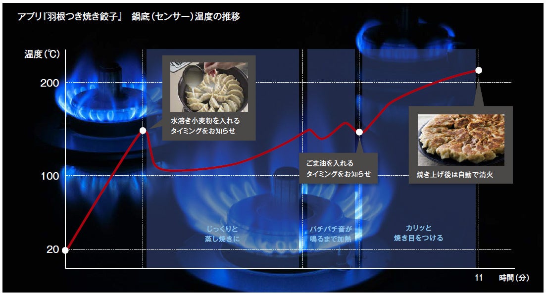 羽根つき焼き餃子の場合、食材や調味料を投入するタイミングを音声でお知らせするとともに、蒸し焼き、焼き付けなどの調理工程に合わせて自動で火力を調節します。さらに、加熱が終われば自動で消火してお知らせするので安心して調理を行えます。