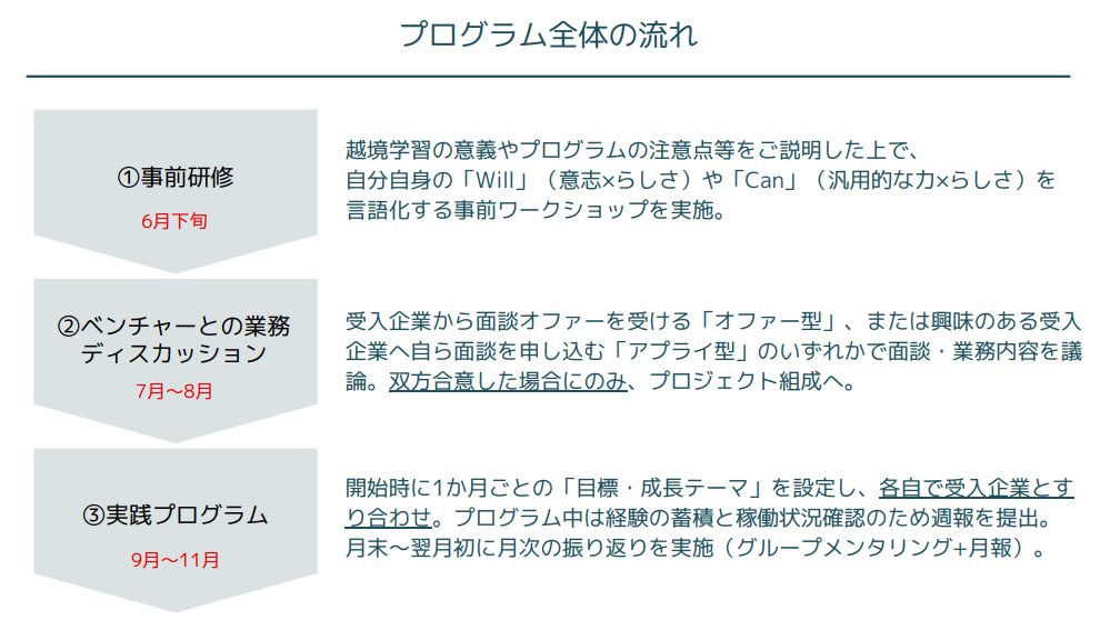 現在、5社から55名がプログラムへの参加を予定しています。参加者は2023年6月に5社合同でのキャリア開発を含む事前研修を終え、7月よりベンチャーとの面談をスタートします。ベンチャーと業務内容の合意に至った参加者は、業務時間の「20%」を活用し、9月〜11月の3ヶ月間、ベンチャー企業において業務を実践します。