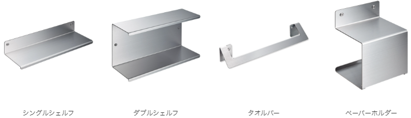 ちょっとした収納棚やタオル掛けは、洗面やトイレ・キッチンに玄関等、お家のあらゆる場所で必要となります。しかし、市場に存在する製品は装飾的なものが多く、また家全体でトータルコーディネートできるものが少ないのが現状です。そこで、1920年にバウハウスが提唱した機能主義(機能を優先的に考えたデザイン)に立ち戻り、”ステンレス1枚”というシンプルな素材でつくり上げる収納アクセサリーシリーズを開発しました。