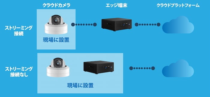 エッジ端末とIPカメラ・クラウドカメラをつなぎ常時交通量・通行量計測をおこないます。「クラウドカメラのストリーミング接続」を活用して解析をおこなうと、屋外設置物がクラウドカメラのみとなり、設置ハードルを大幅に下げることができます。
