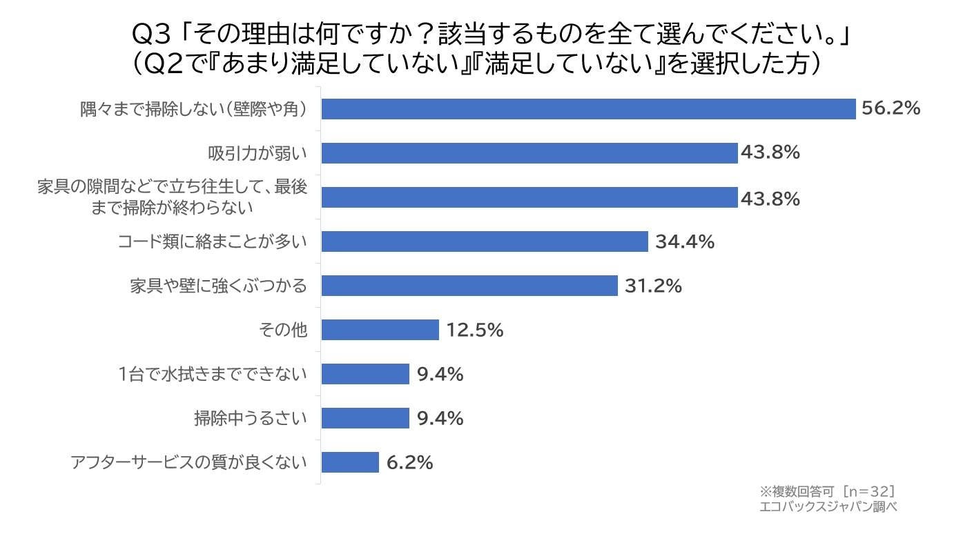 一方で、実際にロボット掃除機を所有する人の約4人に1人は不満を持っている結果に。不満の理由としては、「窓際や角など隅々まで掃除しない(56.2%)」、「吸引力が弱い(43.8%)」、「家具の隙間などで立ち往生して、最後まで掃除が終わらない(43.8%)」が上位となりました。
