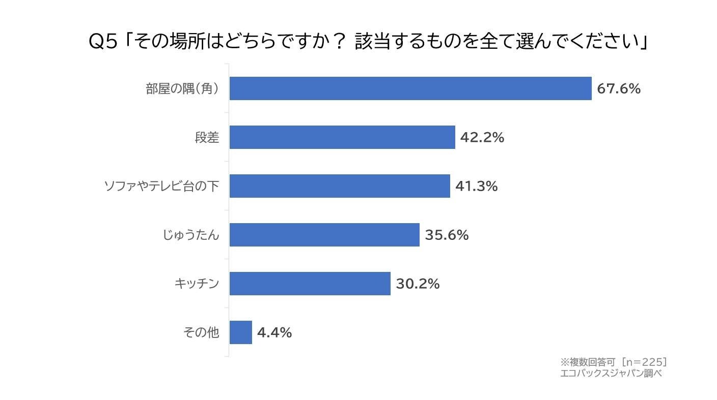 日常の掃除において、ホコリやゴミが取れないと感じる「場所」があると回答した人は全体の94.1%。その場所として挙がったのは、「部屋の隅(角)」が67.6%、「ソファやテレビ台の下」が41.3%、「じゅうたん」が35.6%となりました。