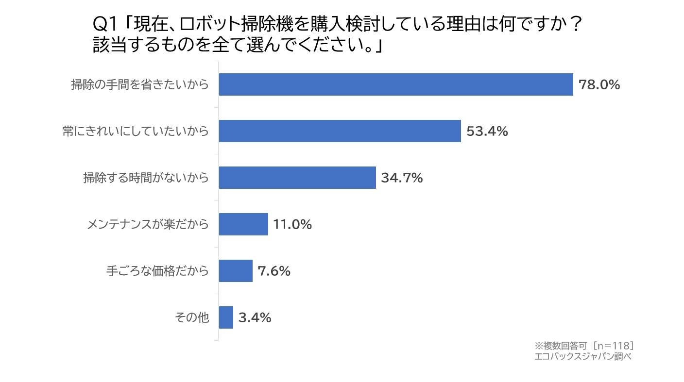 「ロボット掃除機」の購入を検討する最も多い理由は、『掃除の手間を省きたいから:78%』