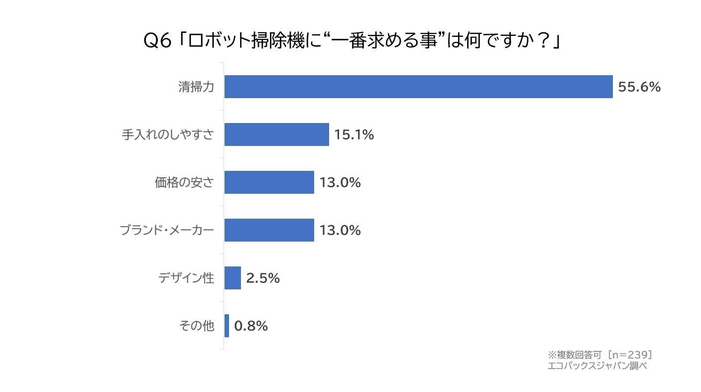 このような悩みもあり、ロボット掃除機に“一番求める事”は何か問う質問では、「清掃力」だと答える人が55.6%と半数を超えました。やはりロボット掃除機の本質である「清掃力」が第一だと過半数が考えていることがわかりました。