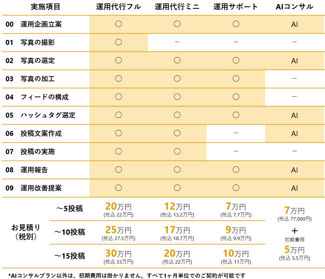 これまでスナップレイスの運用代行プランでは、基本的に弊社独自のシステムを用いて弊社のスタッフをアサインしたうえで、質の高い運用代行サービスを提供していました。これからもそういった運用代行プランは残しつつ、今回は新たにそのスタッフが行っていた運用代行の業務をAIが代行するAIによるインスタグラム運用代行プラン「AIコンサル」のメニューを新設しました。