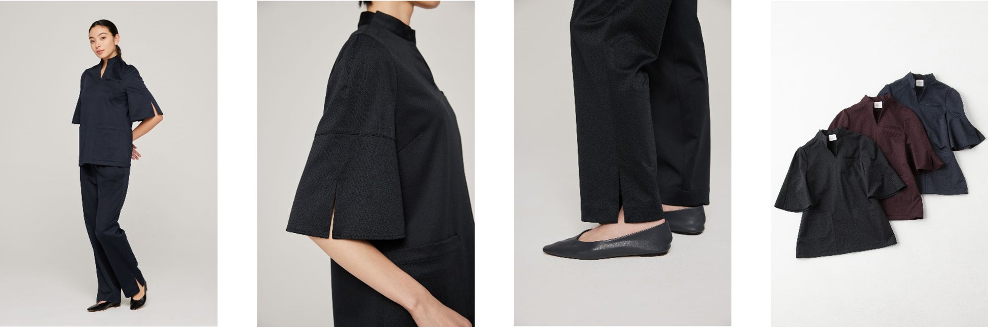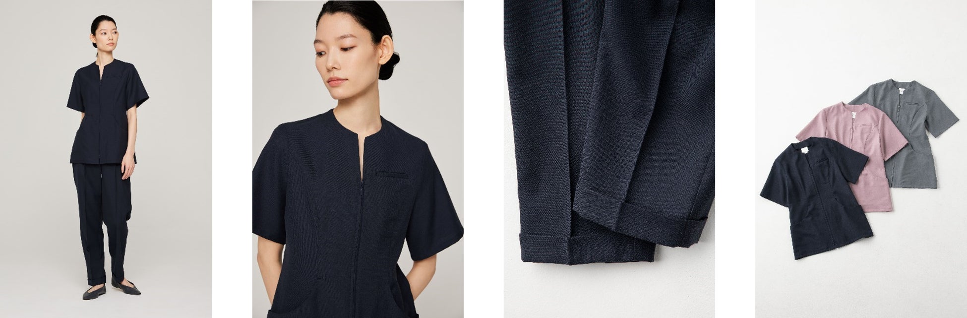 袖には深めのスリットを入れて、モードな雰囲気を演出。ボタンで留めて折り返せば、処置の際に手作業の邪魔になりにくい袖丈に調整ができるのと同時に、カフス風デザインでまた違った表情に変化します。