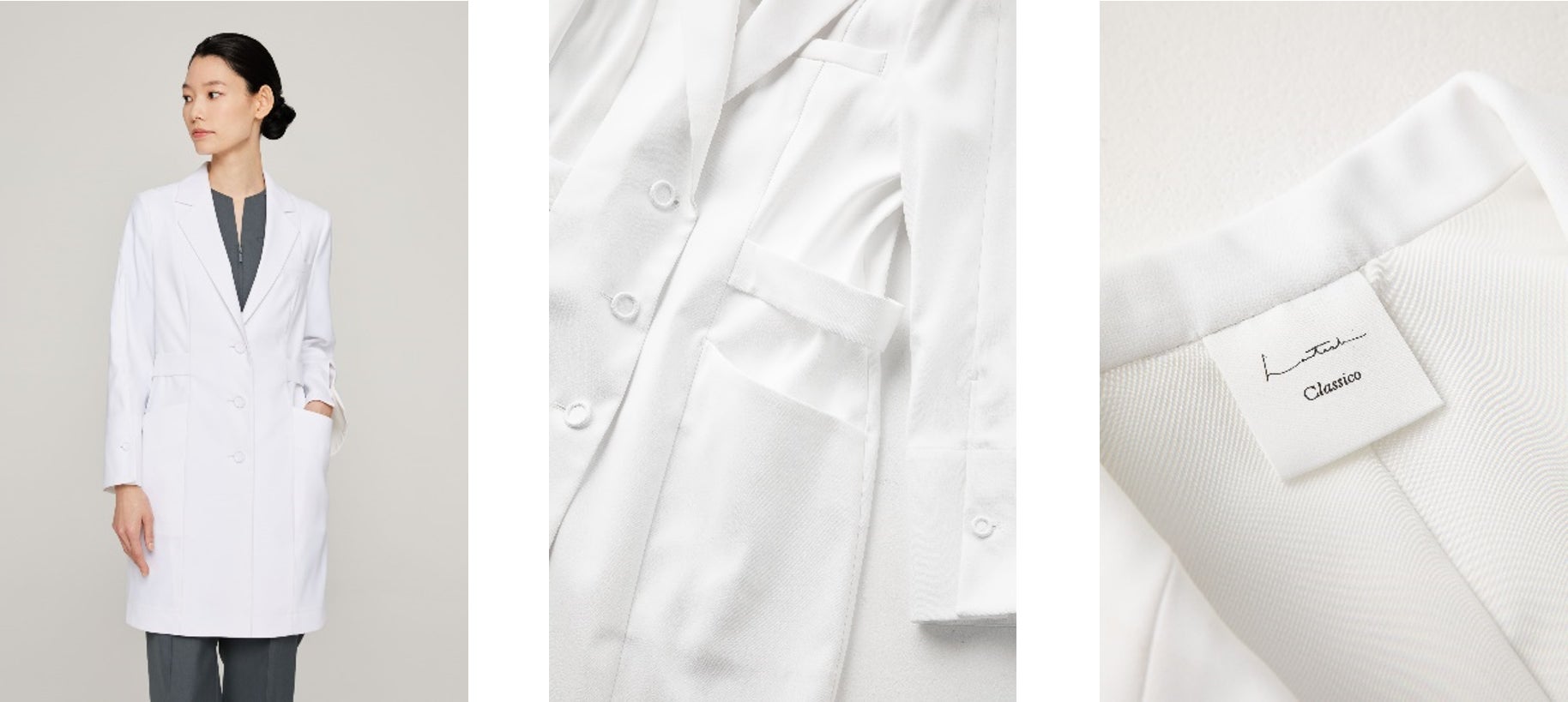 イタリアンテーラード仕立てのスタイリッシュな白衣をはじめとする医療ウェア、