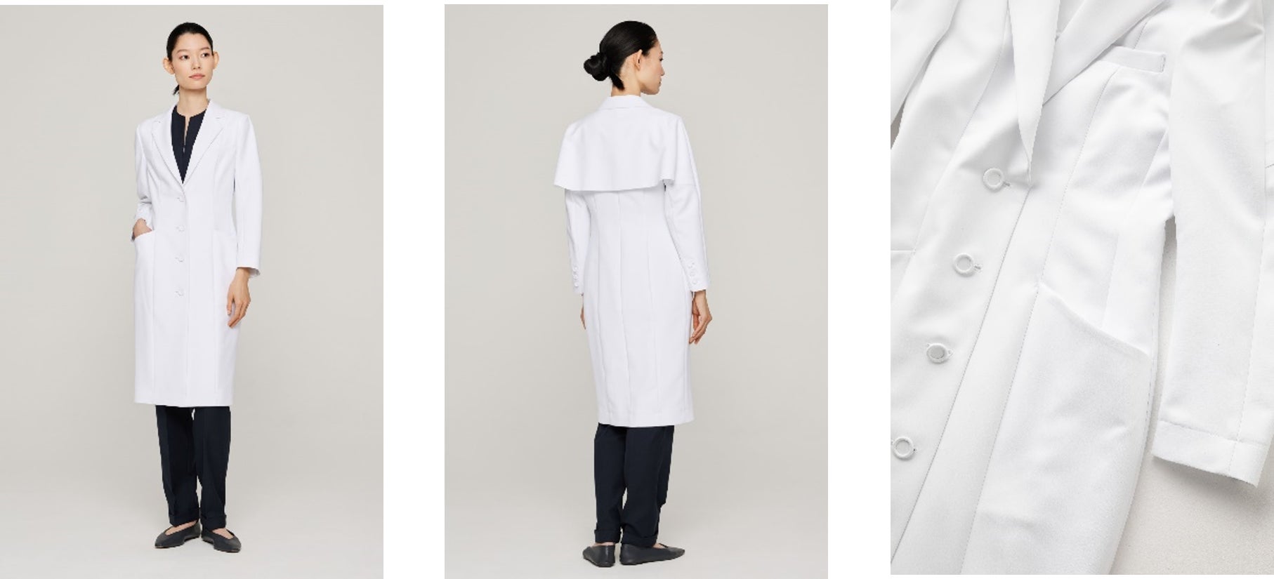 トレンチコートのような背面のケープのディテールは、これまでの白衣にはないモードな雰囲気を演出します。