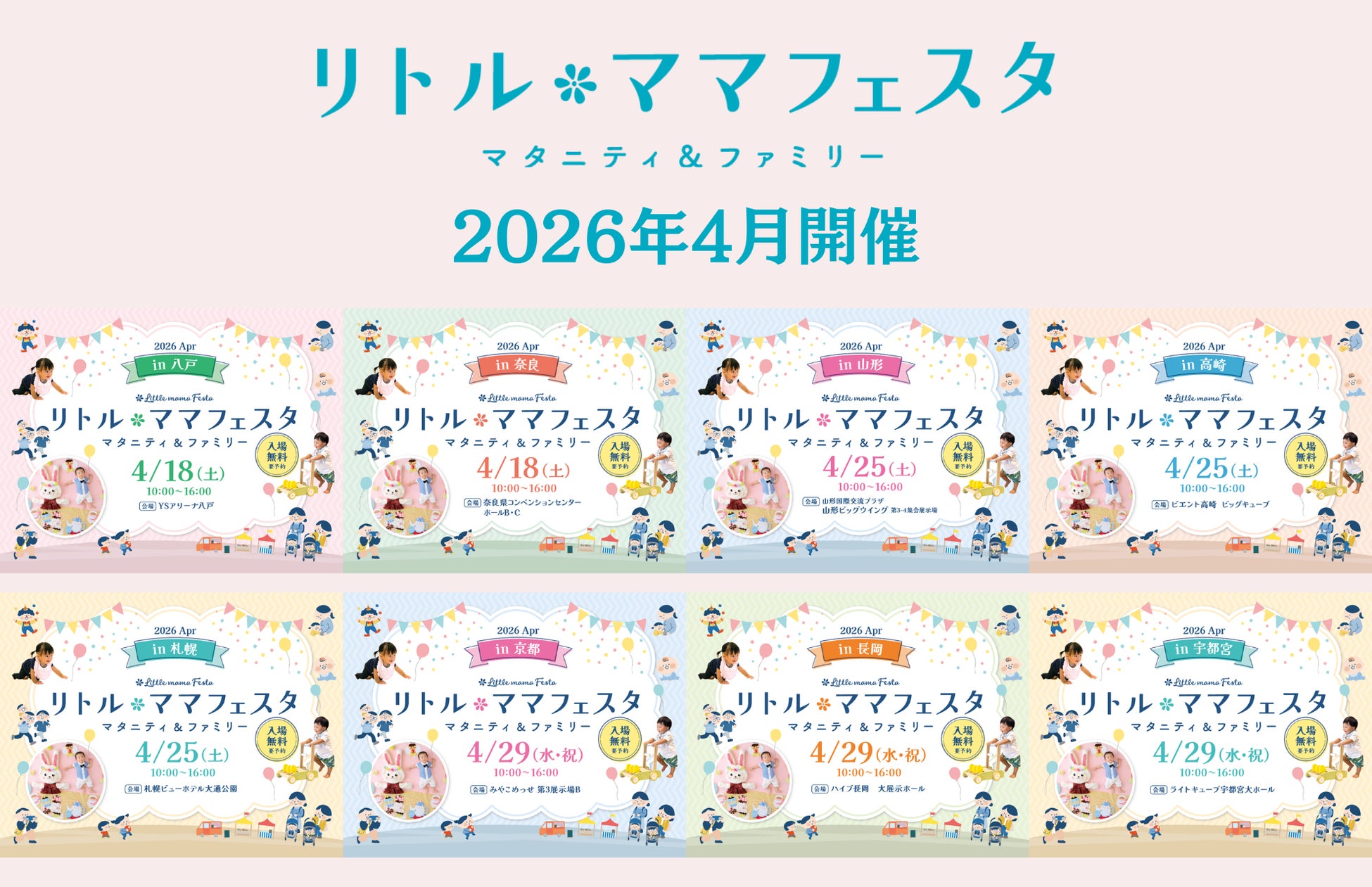 国内最大規模の親子フェスタを開催する株式会社エンファム.(東京本社:東京都港区、福岡本社:福岡県福岡市、代表取締役:森 光太郎)は、4月18日(土)八戸・奈良、4月25日(土)札幌・高崎・山形、4月29日(水・祝)宇都宮・長岡・京都の8都市にて、親子向けイベント【リトル・ママフェスタ】を開催いたします。ママ・パパとお子さまとの『思い出づくりの場』として、ご家族皆様でお楽しみください。