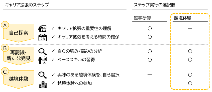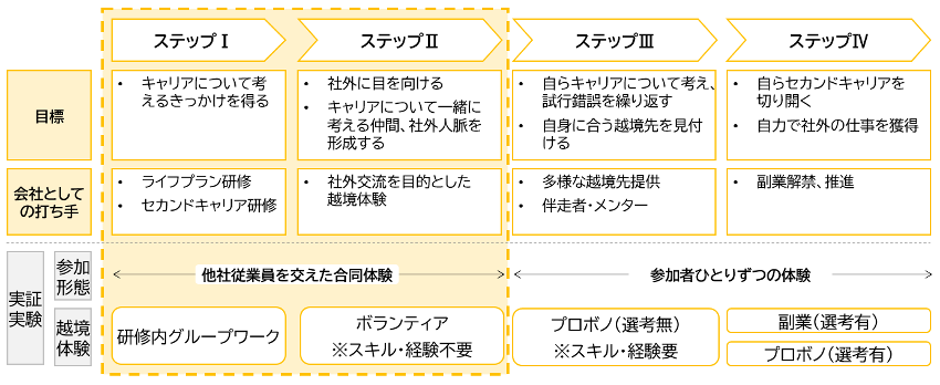 コンソーシアムでは、セカンドキャリアを切り開くまでのステップを4つに分けた上で、まずは社外に目を向け、社外人脈を形成することを狙いとした越境体験から始めることが重要と考えています。
