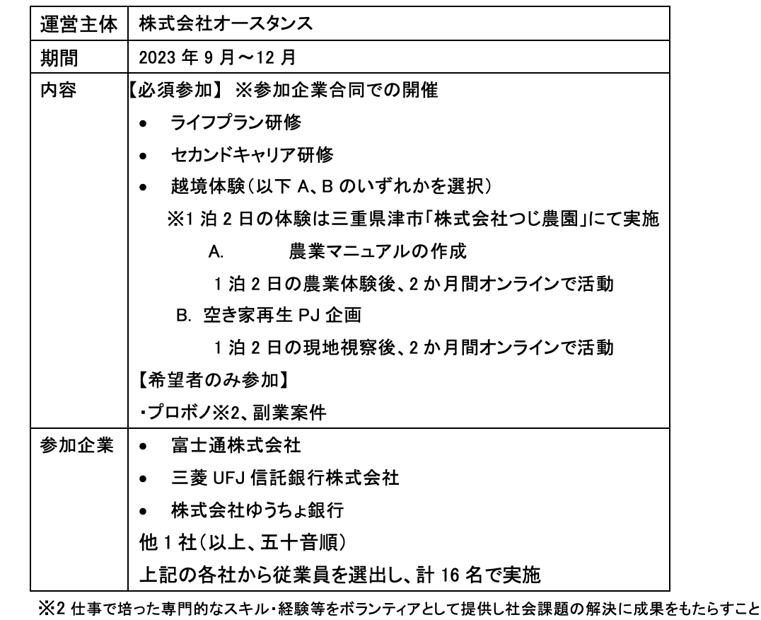 今回の実証実験においては、研修・越境体験ともに各社合同形式で行い、また越境体験の企画も農業体験や空き家再生PJ等、スキル・経験が問われない内容とし、参加ハードルを下げることにより、社外交流の効果を検証します。