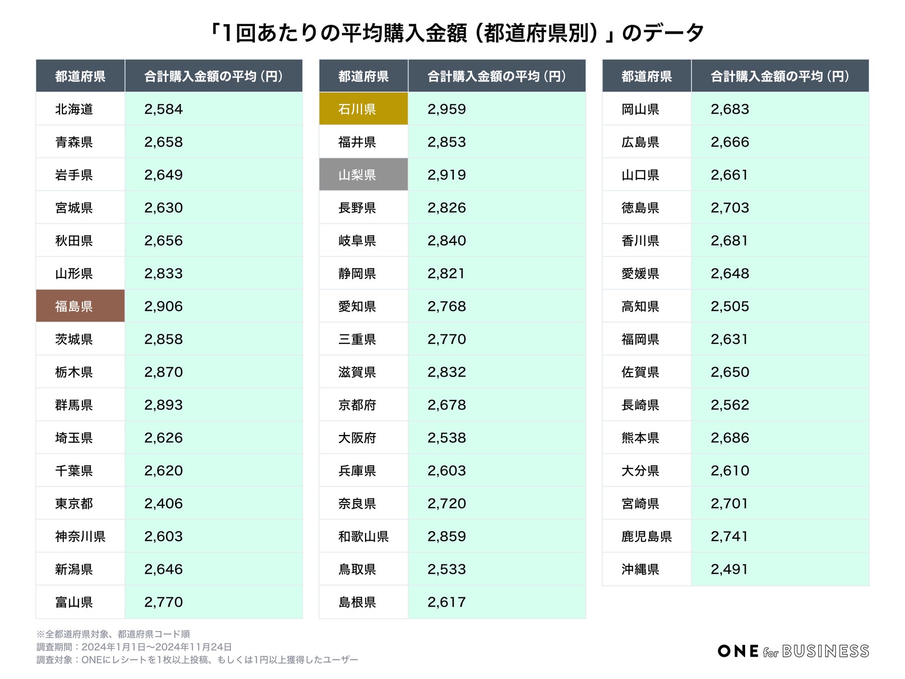 ユーザーの居住地情報をもとに、買い物1回あたりの平均購入金額を都道府県別で調査したところ、今年最も金額が高かったのは「石川県(2,959円)」となりました。