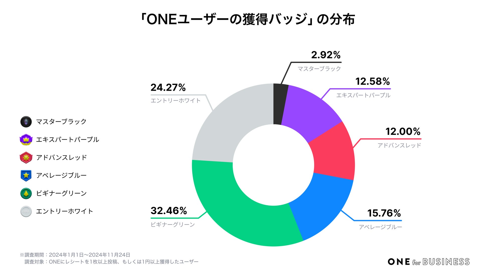 集計の結果、ONEユーザーの半数以上が、新規登録者に付与される「エントリーホワイト(24.27%)」またはONE初心者の「ビギナーグリーン(32.46%)」であることが分かりました。