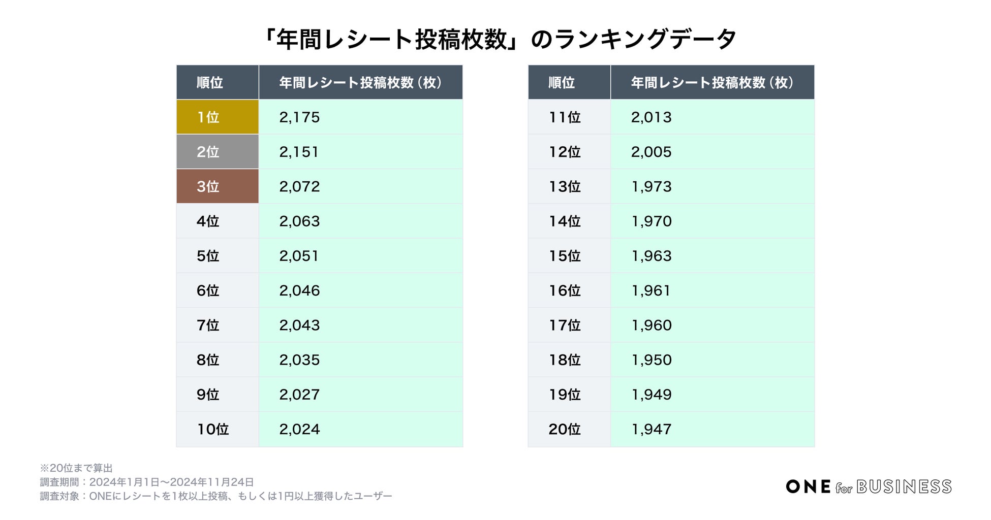 ONEユーザーのうち、年間のレシート投稿枚数が最も多いユーザーは、「2,175枚」投稿していることが分かりました。ついで、「2,151枚」「2,072枚」「2,063枚」と続きます。