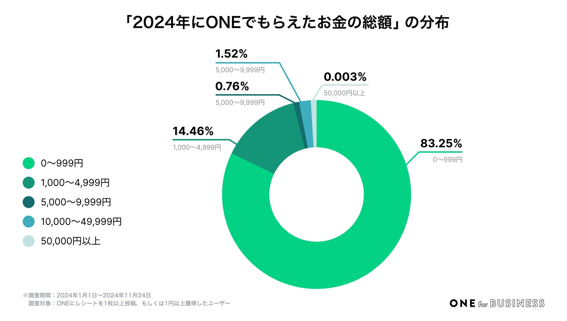 ONEユーザーの年間の総獲得金額を調査したところ、大多数のユーザーは今年ONEでもらえたお金が「0〜999円(83.25%)」でした。ついで、「1,000〜4,999円(14.46%)」「10,000〜49,999円(1.52%)」「5,000〜9,999円(0.76%)」という結果になりました。