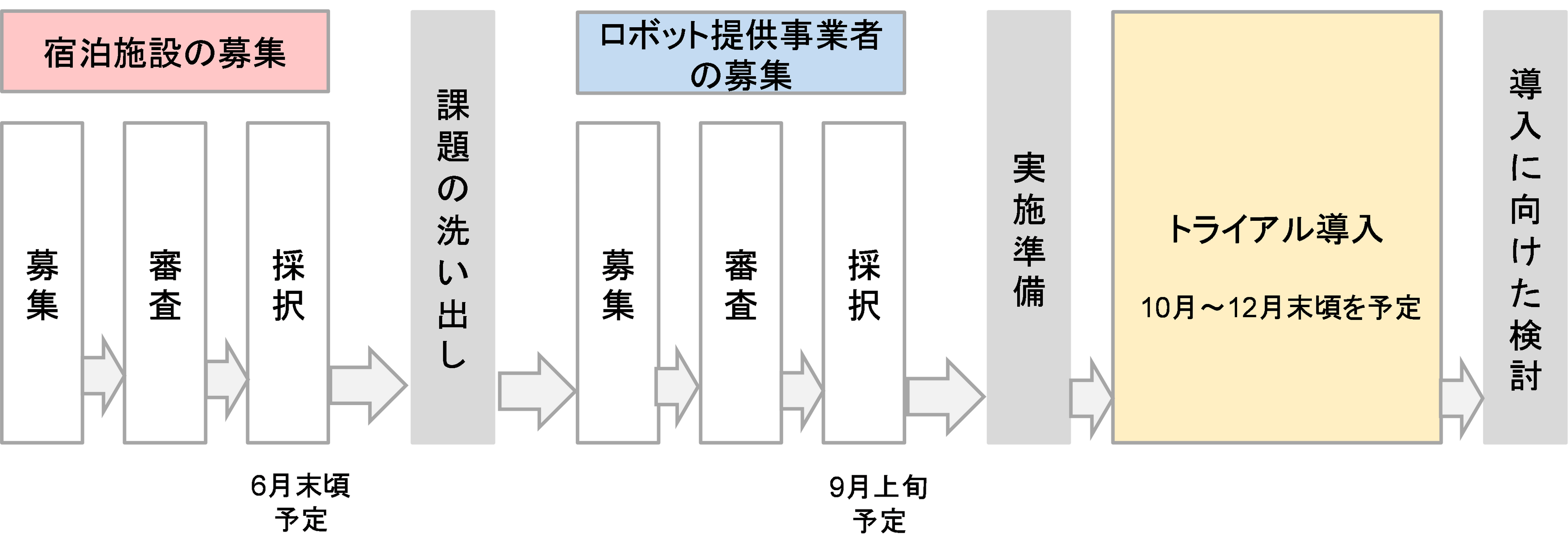 ●ロボットの導入に向け、採択された宿泊施設には本事業で別途採択・マッチングするロボット提供事業者と連携し、一定期間、ロボットのトライアル導入に取り組んでいただきます。