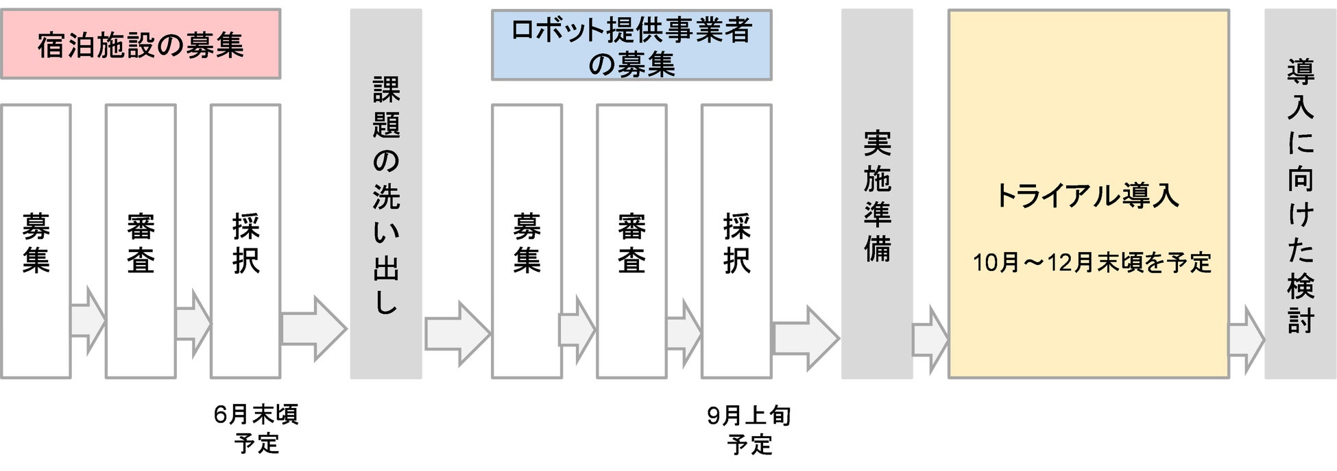 応募のメリット | ・採択された宿泊施設には、ロボットのトライアル導入の経費を1プロジェクトあたり250万円まで支援いたします。また、トライアル後、その結果を踏まえ本格導入に取り組む宿泊施設を対象に、東京都による機器購入費用等の補助を別途実施する予定です。 ※本事業の支援経費は採択した宿泊施設ではなく、ロボット提供事業者に直接支払う予定です。 ・採択された宿泊施設には、ロボットのトライアル導入に対し、施設毎に運営事務局のスタッフが伴走支援をいたします。 |