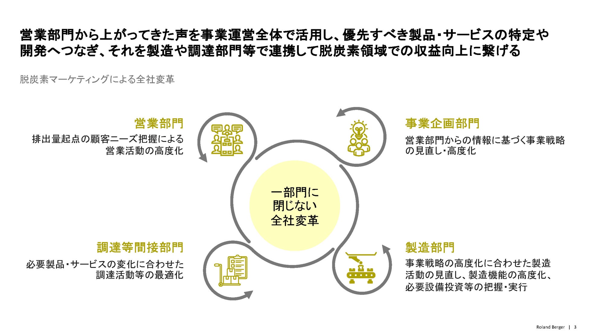 欧州最大級の経営戦略コンサルティングファームである株式会社ローランド・ベルガー(以下、ローランド・ベルガー)は、不透明性が高まり中長期の事業判断が難航化している脱炭素商材の事業黒字化・成長に向けて、事業性を見極める上で重要となる論点を紐解き、企業への提言を記した最新レポート「“脱炭素マーケティング”を起点にした全社変革」を発表しました。