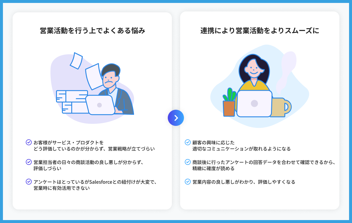例えば、見込み顧客(リード)として登録されたお客様のサービスに対する興味度合や、商談後に行ったアンケートの推奨度を定量的に確認したり、取引先責任者として登録されている契約中のお客様のサービスに対する満足度の遷移を確認するなど、より深く顧客を理解した事業運営の実現を支援します。