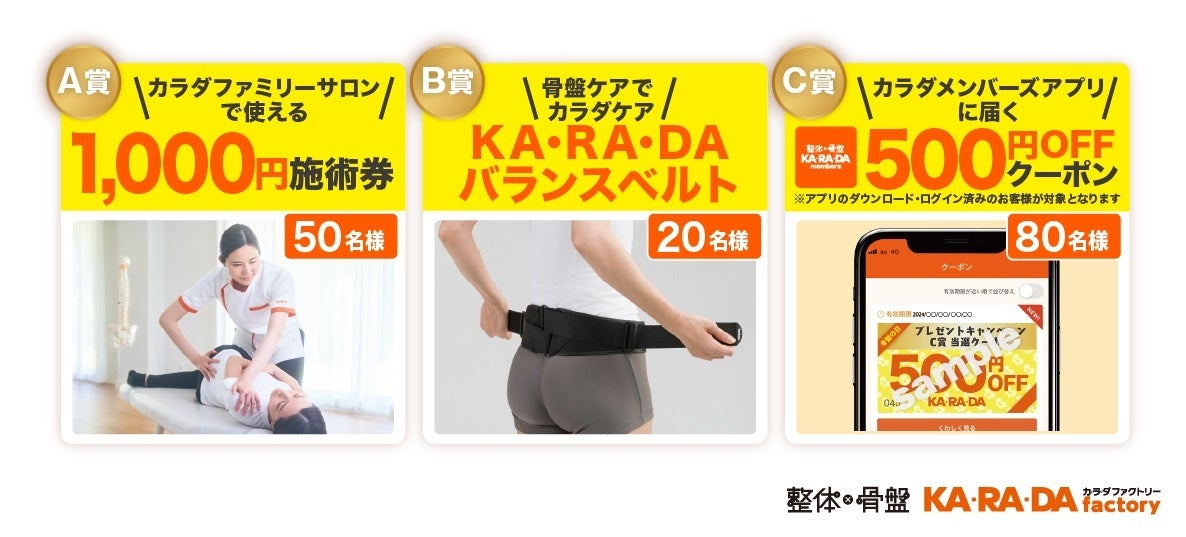 ・A賞 1,000円施術券 50名 ・B賞KA・RA・DA バランスベルト20名様 ・C賞カラダメンバーズアプリに届く500円OFFクーポン80名様 ※アプリのダウンロードログイン済みのお客様が対象となります。
