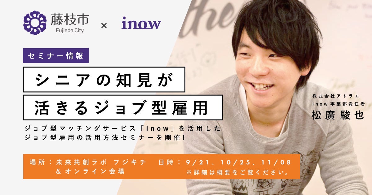 今回は、参加対象を藤枝市にて事業展開する事業所のみなさまに限定し、より地域に密着したジョブ型雇用の実現に向け、具体的な採用手法のご説明や地域課題の解決につながるジョブの切り出し方や、細かいInowの運用方法等をお伝えする予定です。