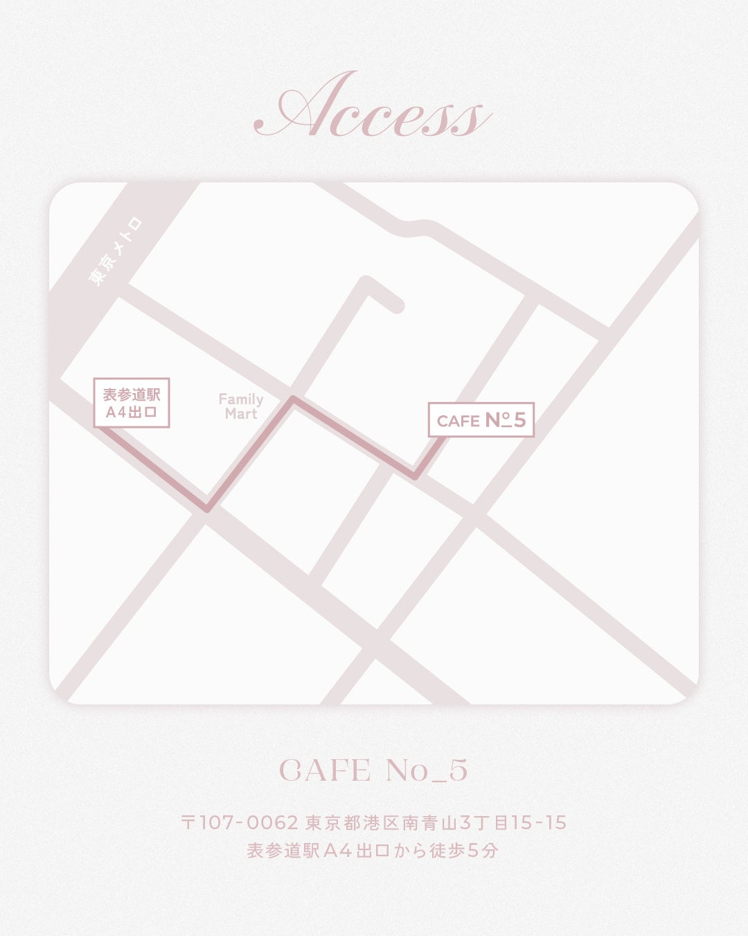 ・アクセス:CAFE No_5 〒107-0062 東京都港区南青山3丁目15−15 表参道駅A4出口から徒歩5分