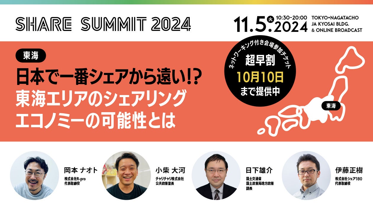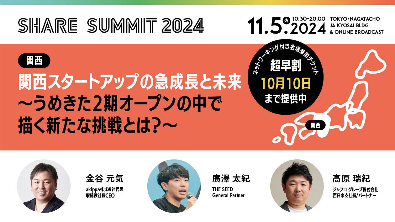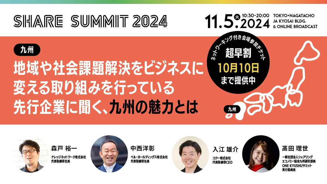 一般社団法人シェアリングエコノミー協会(代表理事:上田祐司、石山アンジュ)は、2024年11月5日(火)に、シェアリングエコノミーがもたらす新たな地域経済圏の祭典「SHARE SUMMIT 2024」(https://sharing-economy.jp/ja/sharesummit/ss2024 )にて、メインエリアでの地域特化セッションを開催します。あわせて、全国7支部による地域特化セッションの登壇者情報の公開を開始しました。なお、現在、ネットワーキング付き会場参加チケット(前年「ネットワーキングチケット」)は、前年比の4倍(開催36日前時点での比較)の申込数となっています。