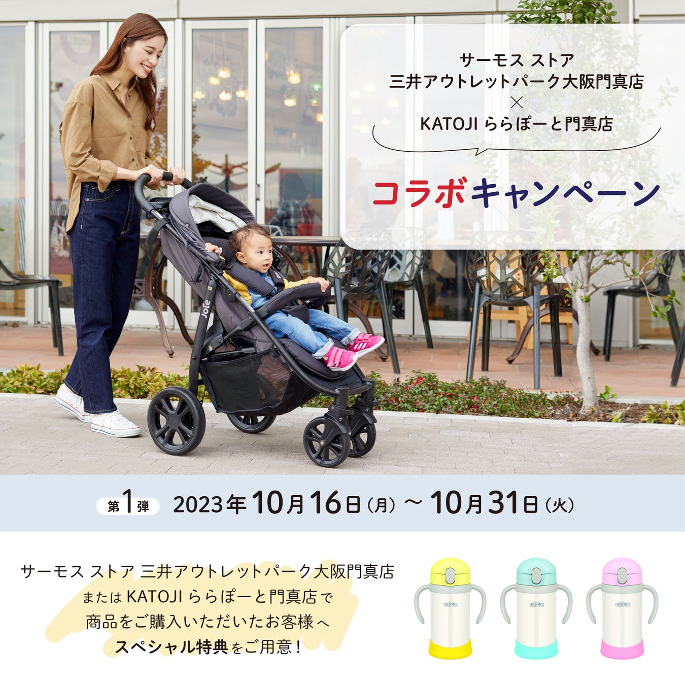 こだわり派のパパママのために、流行を意識したデザインや最新機能にこだわったベビー用品を取り扱う株式会社カトージ(本社・愛知県犬山市 代表取締役社長・加藤浩一)は、魔法びんのパイオニアであるサーモス株式会社の直営店「サーモス ストア 三井アウトレットパーク大阪門真店」との初めてのキャンペーンを実施します。