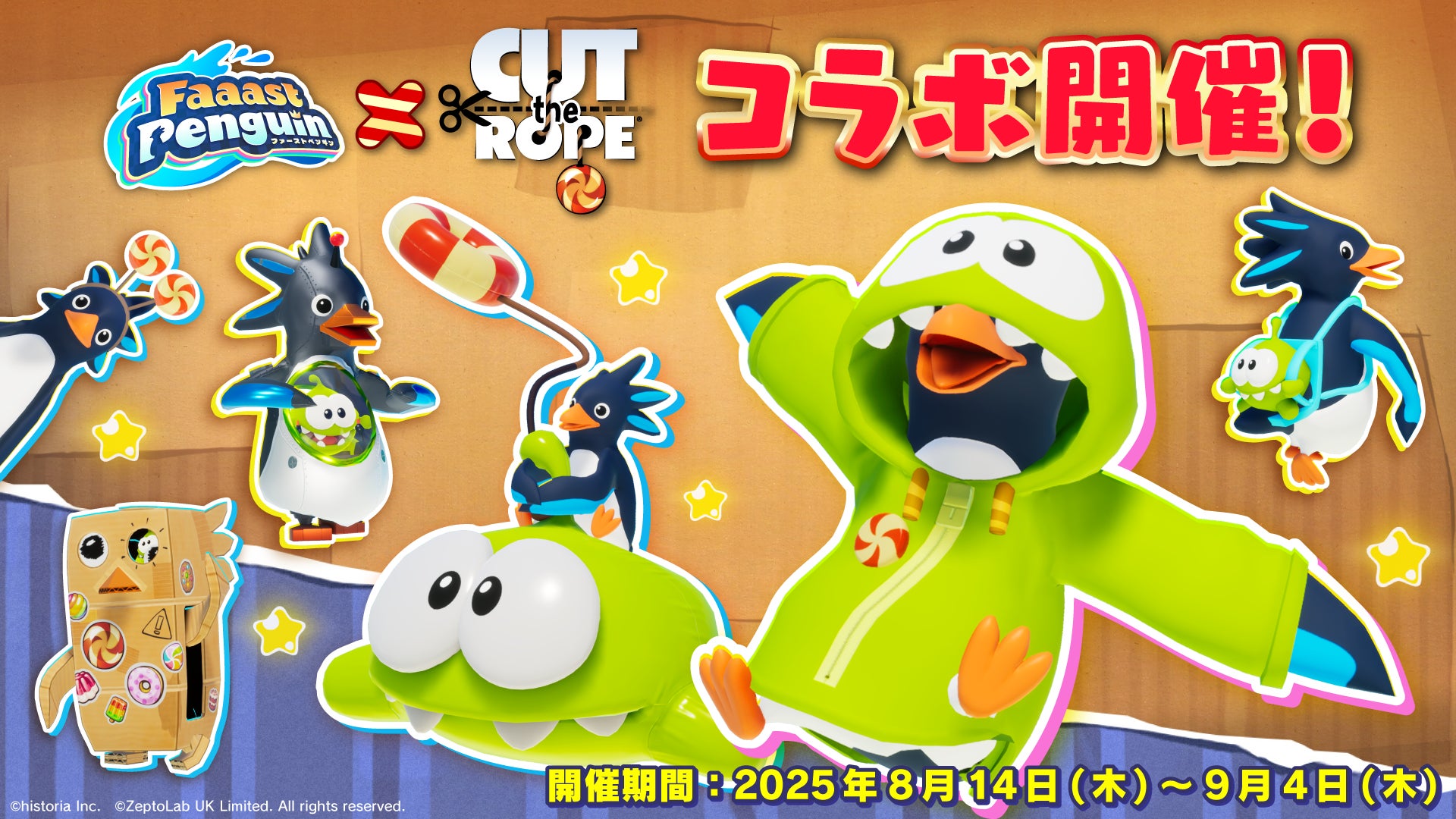 株式会社ヒストリアは、サバイバルアクションレース『Faaast Penguin』(ファーストペンギン)と、全世界で7.5億DL超えのパズルゲーム『カット・ザ・ロープ』とのコラボイベントの詳細を公開しました。