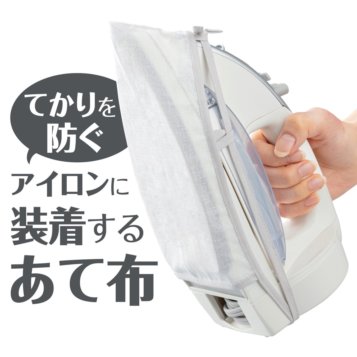アイロンに装着するタイプのあて布で、衣類のてかりをおさえることができます。あて布をずらす必要がないので、衣類の折り目、ワッペンやアップリケなど細かいものも直接確認しながらスムーズにアイロンがけができます。