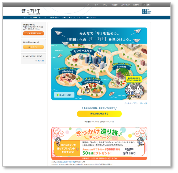 「きっかけ」(https://www.beach.jp/community/KIKKAKE/)は、産経新聞社とクオンが、共同で運営しているオンライン上のコミュニティです。ショッピングモールのようなイメージで発展していくのが特徴の1つで、「きっかけ」は、中心(センター)にある広場のような役目を果たしています。ユーザーはセンターコミュニティである「きっかけ」で、さまざまな会話やキャンペーンを楽しみながら、テナントにあたるクライアントの“パートナーコミュニティ”にも自由に参加、回遊し、コミュニケーションが活性化しています。