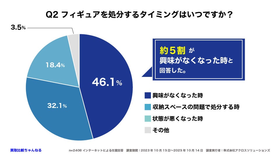 最も高い割合を示したのが「興味がなくなった時」で46.1%、次点で「収納スペースの問題で処分しなくてはいけなくなった時」が32.1%となりました。