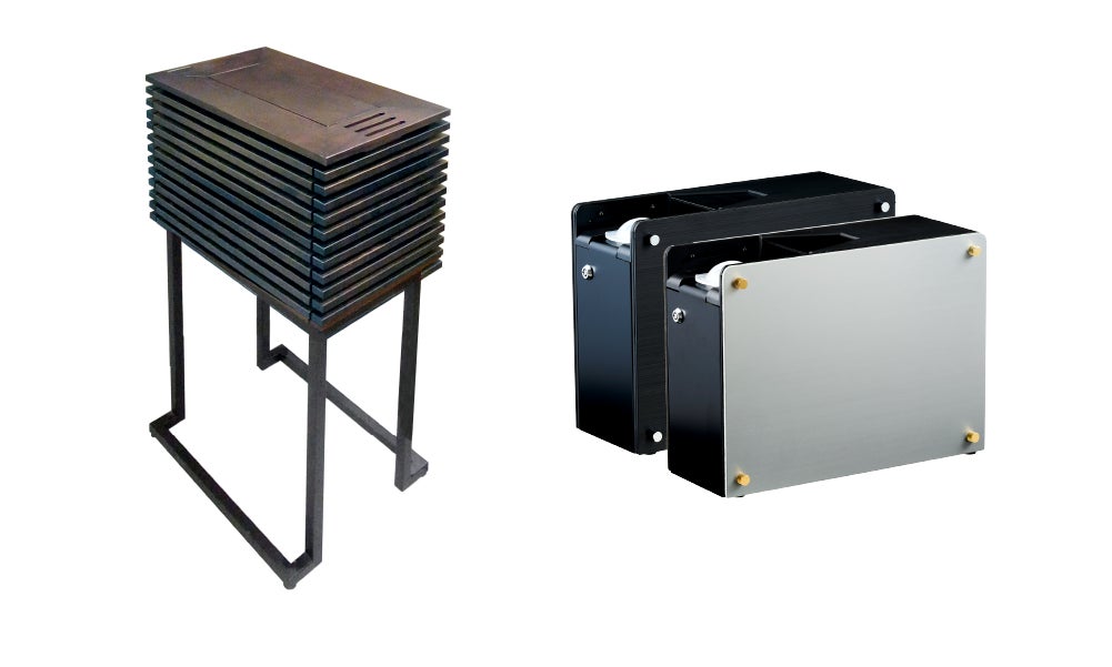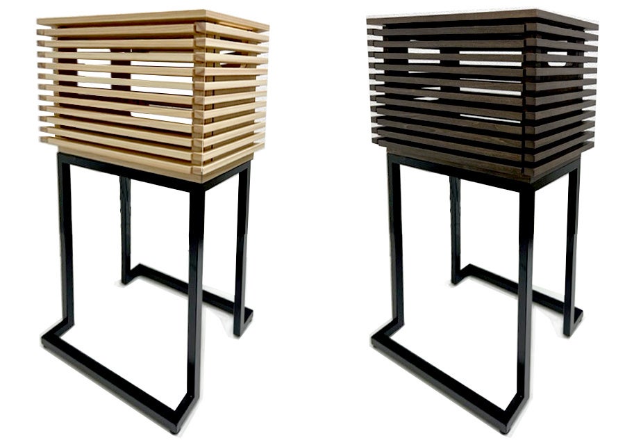 華美な装飾を排し、黒のアイアン製スタンドの上に横格子の木製BOXを乗せたこの木製オリジナルカバーは、正倉院の外観を彷彿とさせるシンプルな作りとなっており、日本の‶美″を徹底的に追求しています。木材の色は、標準色がヒノキ材の白木とウオルナット調のダークブラウンの2色となっていますが、お客様のご要望に合わせて色のカスタマイズも可能です。