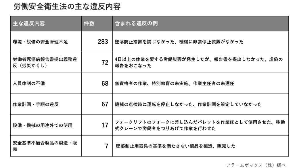 労働安全衛生法違反が多かった業種は、建設業(240件)、製造業(117件)であり、建設現場や工場などでの安全管理不足が多くなっています。