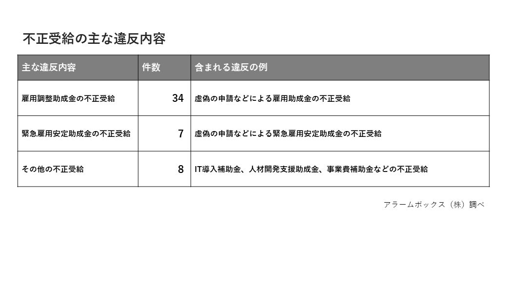 補助金の交付については、補助金適正化法や補助金の内容にあわせた関連法令で、交付申請や不正な使用の防止についてのルールが定められています。これらのルールに従わず、不正受給を行い社名の公表に至った企業が散見されました。特にコロナ禍中の事業者に向けた補助金である、雇用調整助成金と緊急雇用安定助成金の不正受給が多くなっていました。