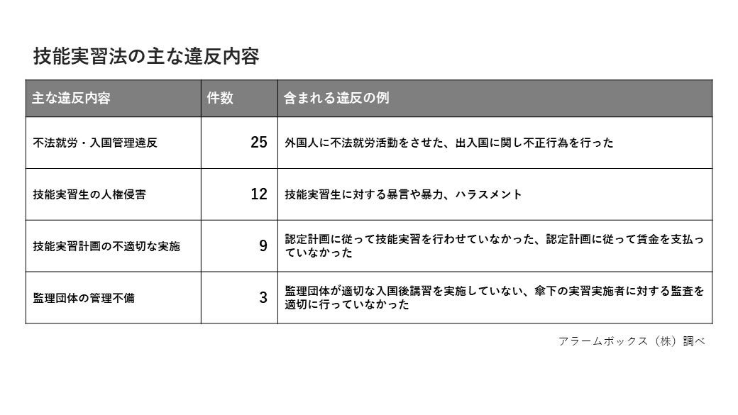 技能実習の適正な実施及び技能実習生の保護を図る技能実習法違反の中で特に多かったのは、就労できる在留資格を有していない外国人の雇用や、出入国在留管理庁からの許可を超えた就労をさせた不法就労、出入国に関する不正でした。また、技能実習生へ人権侵害を行ったことによる認定の取り消しも散見されました。
