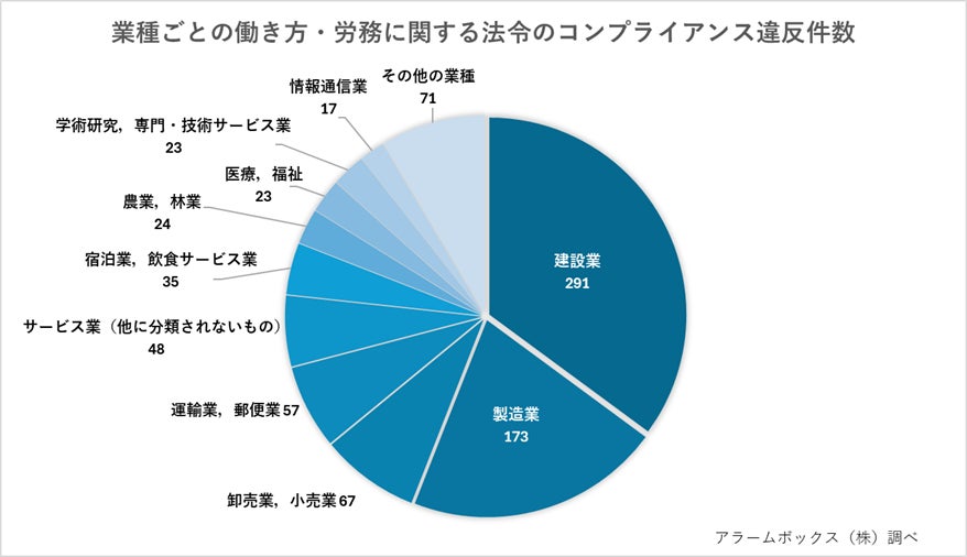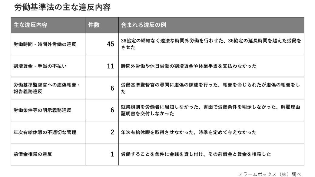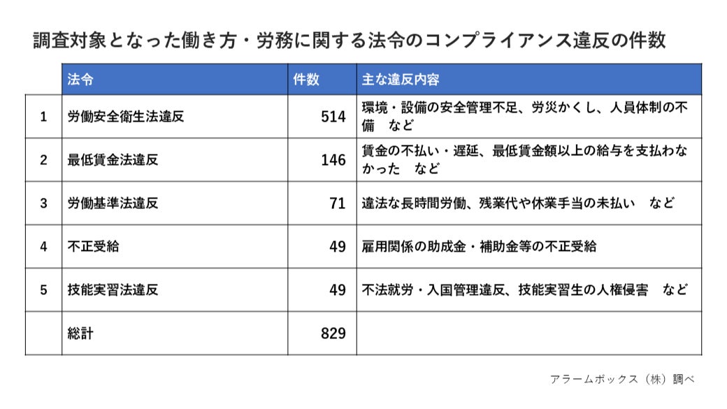 AI与信管理サービスを提供するアラームボックス株式会社(本社:東京都新宿区、代表取締役:武田浩和、以下「当社」)は、この度、2024年1月1日~2024年12月31日に官公庁が公表した行政処分および行政指導の中から、働き方・労務に関する違反829件を抽出し、違反内容や業種別リスクを分析した、2024年 働き方・労務に関する法令のコンプライアンス違反調査を発表します。