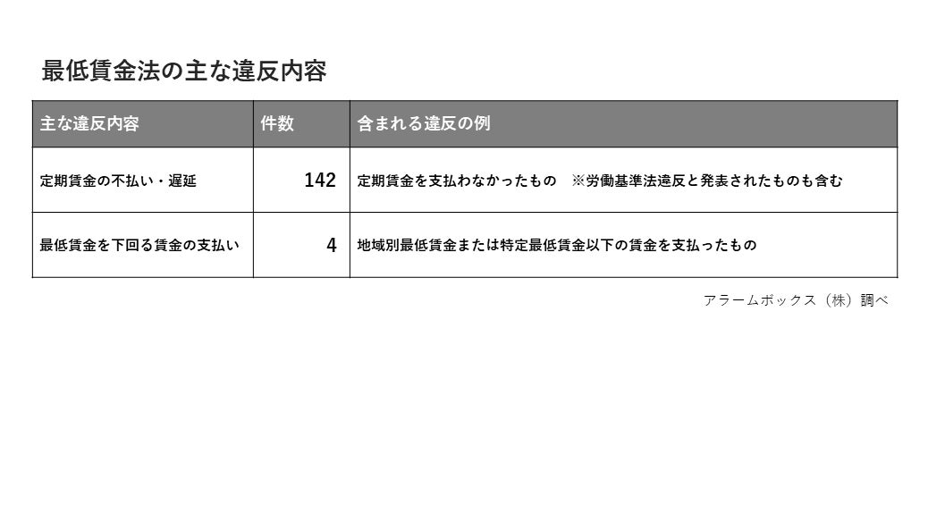 最低賃金法では、企業に対し都道府県ごとに定められている「地域別最低賃金」もしくは特定の産業ごとに定められている「特定最低賃金」の以上の定期賃金を支払うことが義務付けられていますが、これに違反した企業が多くなっていました。